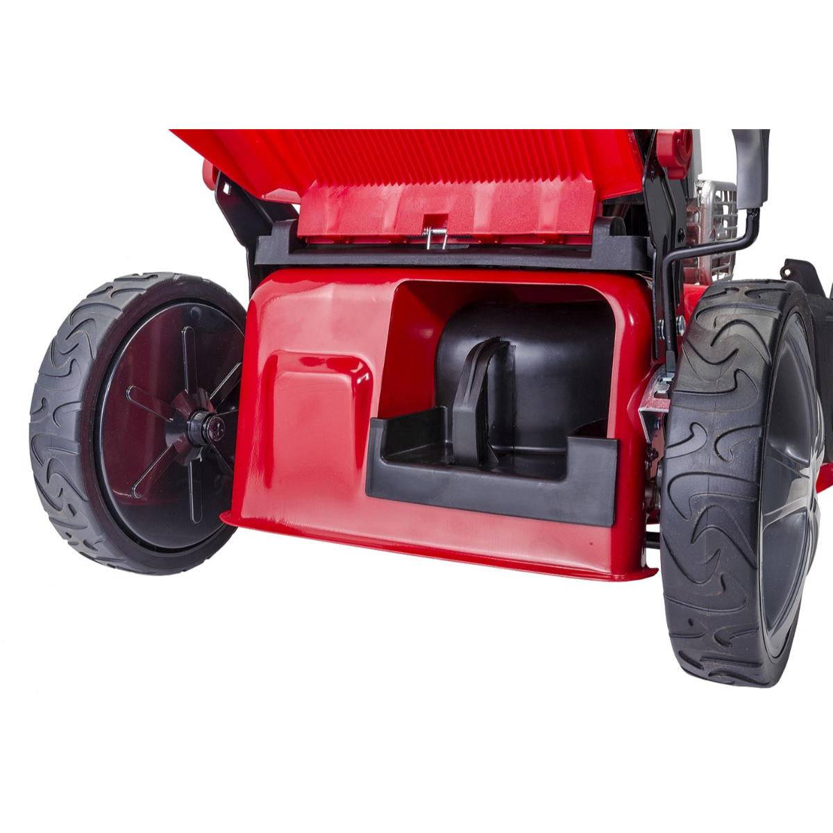 Rotaciona samohodna kosilica za sve vrste travnjaka. Benzinski četverotaktni motor ima optimalne snage da u svakom trenutku može isporučiti dovoljno snage za sva opterećenja. Lako paljenje pomoću startnog mehanizma kojeg možemo postaviti u dva položaja: prvi položaj kao kraća potezna špaga odmah na motoru ili drugi položaj kao duža potezna špaga kako bi nam ručica startnog mehanizma bila bliže glavnim ručkama. Zahvaljujući dobro osmišljenom dizajnu i nožu posebnog oblika, rotirajući nož generira snažan usis da bi se trava podigla prije rezanja što osigurava čist rez. Visinu košnje je moguće centralno podesiti uz pomoć centralnog sustava za podešavanje visine u više položaja. Svi kotači imaju ugrađene kuglične ležajeve, što u kombinaciji sa velikim kotačima osigurava nesmetan rad na svim visinama trave ili konfiguracijama terena. Pogon na zadnje kotače pruža izuzetno komforan rad i pri dužem košenju. Čvrsto metalno kućište osigurava dugu trajnost i veliku čvrstoću. Na prednjem dijelu kućišta nalazi se maska koja je izvedena u obliku češlja, a doprinosi boljoj raspodjeli trave i usmjeruje je direktno na nož. Moguće je kosilicu podesiti vrlo jednostavno u jedan od četiri moda rada: košnja sa skupljanjem trave u košaru, košnja sa bočnim izbacivanjem trave, košnja sa stražnjim izbacivanjem ili košnja sa malčiranjem trave. Košara velike zapremine je izvedena u kombinaciji tekstila i PVC materijala. Ručke je moguće podesiti u željeni položaj pomoću dvije kopče. Poseban dodatak na ručkama je i držač za piće te spremnik za naočale. Ovaj model je opremljen priključkom na koji može biti spojeno standardno crijevo za vrt pomoću brze spojnice kako bi čišćenje nakon upotrebe bilo što jednostavnije i lakše.