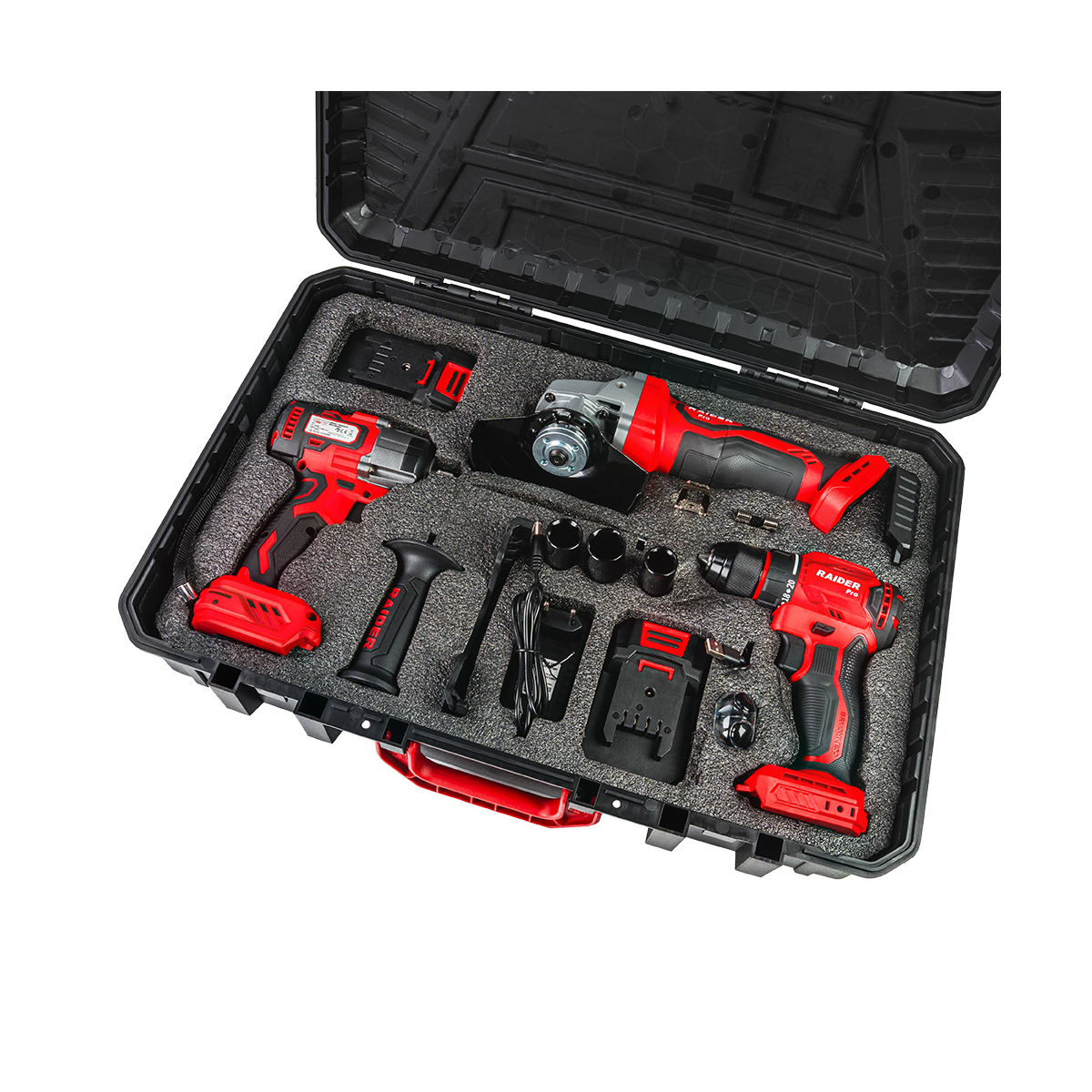 Set aku bušilica odvijač i brusilica Raider 030255 sa dvije baterije i punjačem u koferu i gratis bežične slušalice