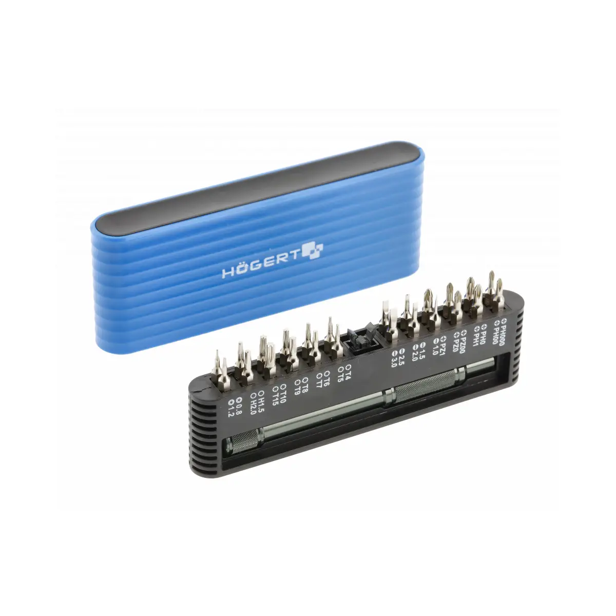 Set od 25 bitova odvijača s adapterom. Izrađen od visokokvalitetnog legiranog čelika za izdržljivost i otpornost na deformacije. Koristi se u radionici te pri popravcima i građevinskim radovima.