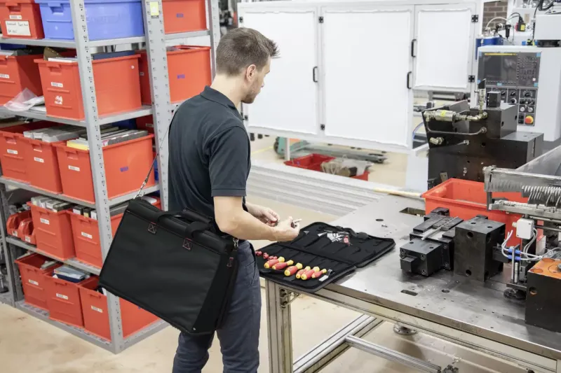 Torba za alat koja se potpuno rasklapa nudi puno prostora za odlaganje i preglednu organizaciju, zahvaljujući patentnom zatvaraču, ručki za nošenje i džepovima za ručne alate. Izolirani odvijači SoftFinish® electric slimFix lako dopiru i do duboko postavljenih vijaka i opružnih elemenata zahvaljujući svojim izuzetno tankim oštricama.