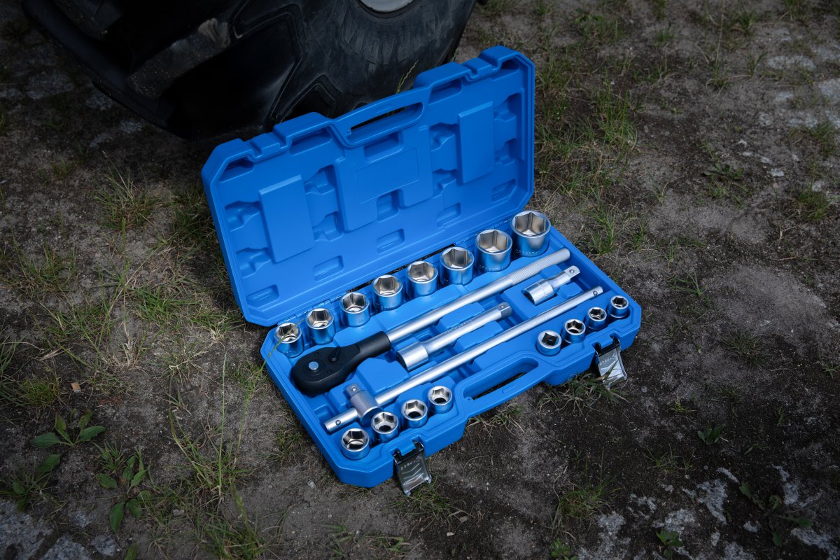 Set od 21 elementa, uključujući račvu, nastavke i ostali pribor od 3/4″. Neophodan u svakoj radionici ili autoservisu.