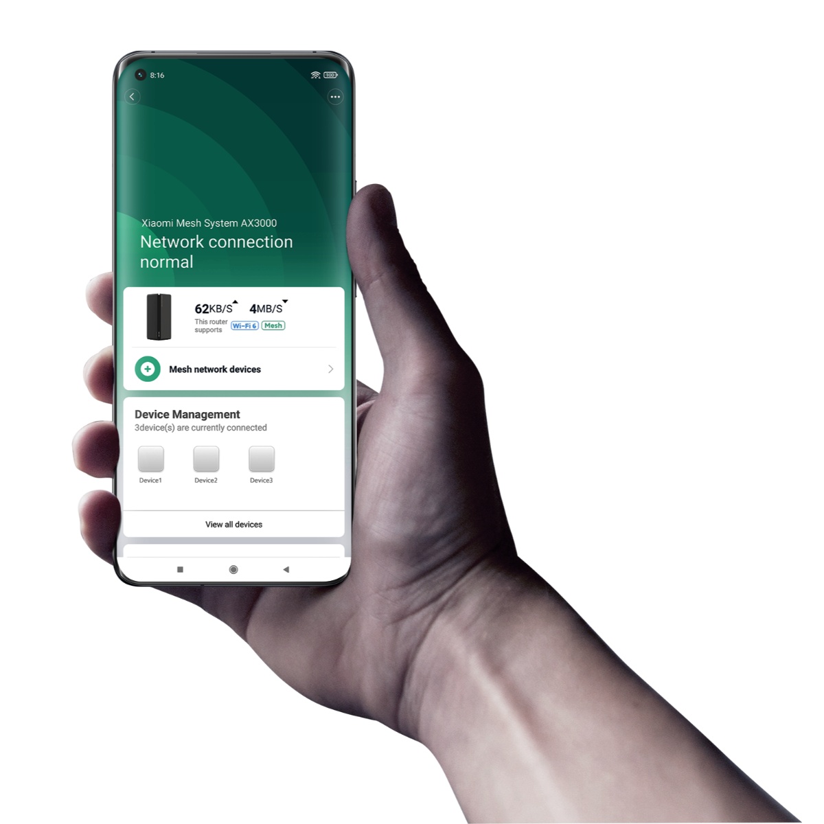 Xiaomi Mesh System AX3000 (2-Pack) podržava inteligentnu kontrolu putem Xiaomi Home/Mi Home aplikacije, pojednostavljujući konfiguraciju mreže tako da čak i korisnici početnici mogu lako pristupiti brzim mrežama.
