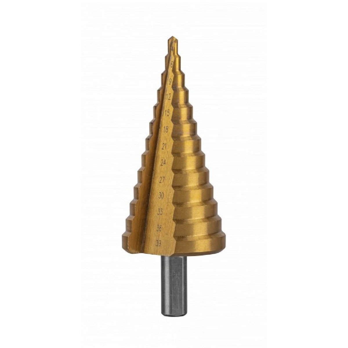 Stupčasto svrdlo prilagođeno za bušenje u raznim vrstama čelika, obojenih metala, bakra, mesinga i aluminija, nehrđajućeg čelika, plastike i drva. Omogućuje bušenje preciznih rupa. Može se koristiti u limarskim i bravarskim radionicama, autoradionicama ili kod instalatera i električara. Za profesionalnu upotrebu.