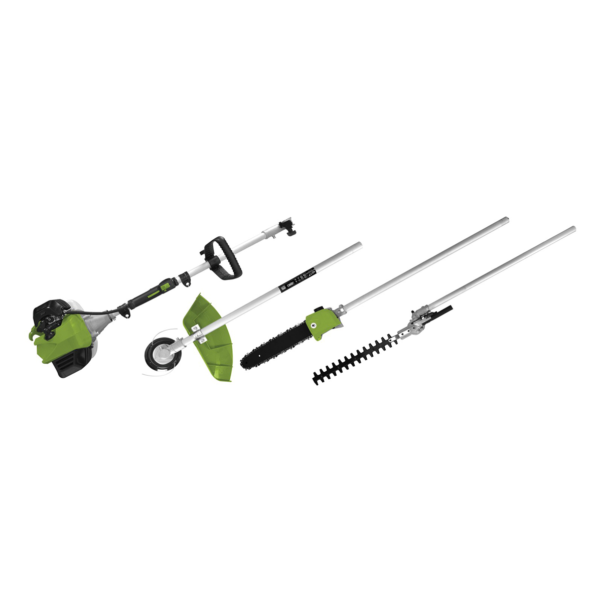 Agrina multifunkcionalni trimer sa dodacima za živu ogradu, motornu testeru, trimi glave i nož, sa dodatnom opcijom za freza koja se koristi kao dodatak.