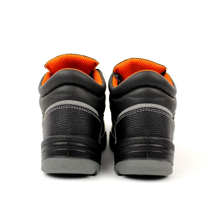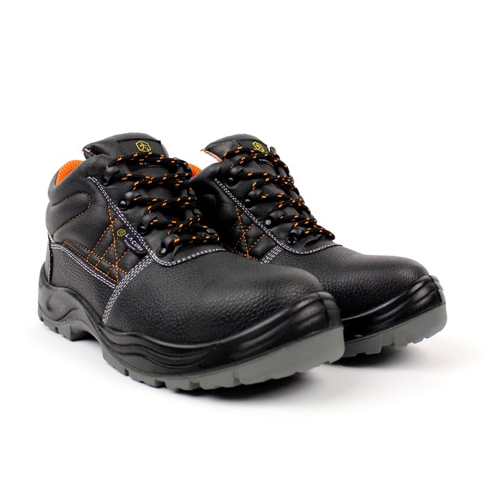 Visoke zaštitne cipele u crnoj koži sa postavljenim jezikom za bolju udobnost i zaštitu.