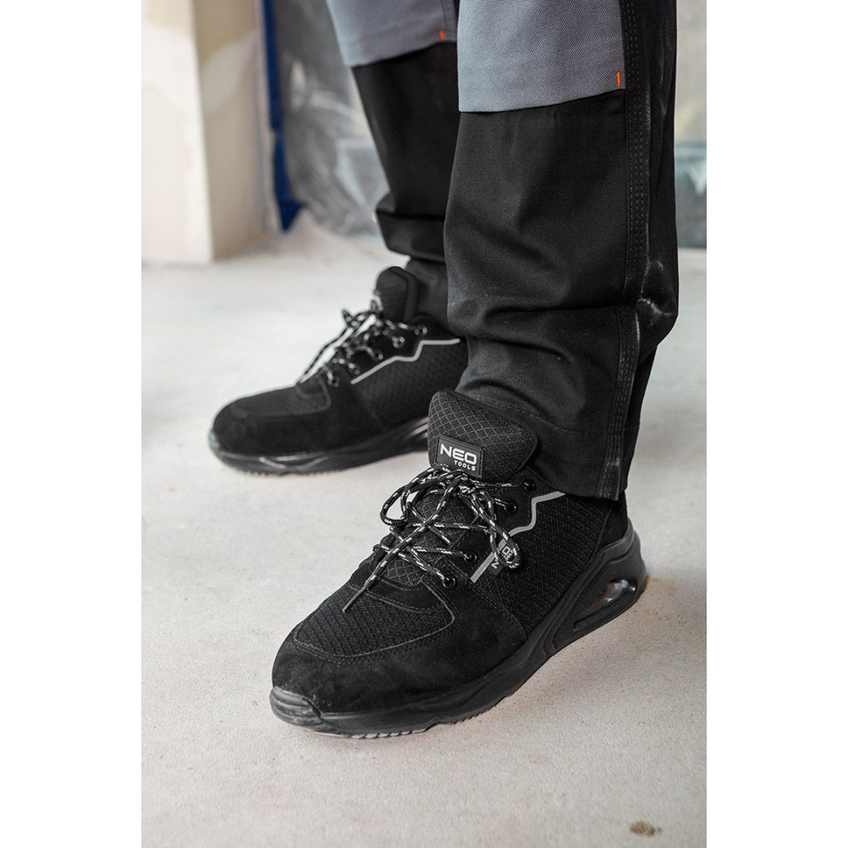 NEO TOOLS SR Neo Air radne patike (82-171) predstavljaju moderan i funkcionalan model radne obuće razvijen uz Neo Air tehnologiju za veću udobnost i sigurnost. Opremljene su čeličnom zaštitom u prednjem dijelu i reflektirajućim elementima koji povećavaju vidljivost u uslovima slabog osvjetljenja. Unutrašnjost čine tekstilna podstava i uložak od HI-POLY pjene sa mekim zonama, što omogućava visok nivo udobnosti tokom cjelodnevnog korištenja. Gornjište je izrađeno od kombinacije tekstila i antilop kože, sa dodatnim ojačanjima na dijelovima koji su najviše izloženi habanju. PU đon sa ugrađenim zračnim jastukom obezbjeđuje dobru amortizaciju i stabilnost. Model je klasifikovan u SR kategoriju otpornosti na klizanje, što znači da pouzdano prianja na keramičkim površinama premazanim glicerolom. Čelična zaštita u prednjem dijelu izdržava udarce energije do 200 J. U cjelini, ovo su lagane, sportski oblikovane radne patike sa antistatičkim svojstvima, idealne za profesionalnu upotrebu i svakodnevni rad u raznovrsnim uslovima.