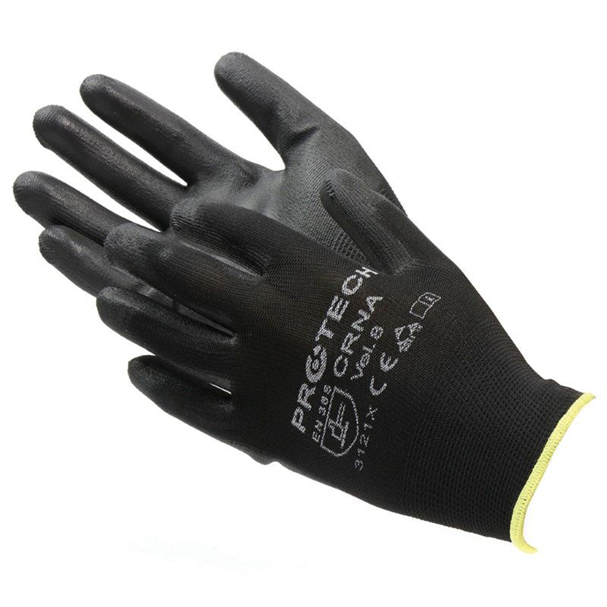 Protech crne rukavice su namijenjene upotrebi prilikom izvođenja finih građevinskih radova, čišćenja, krečenja, u autoindustriji, transportu, skladištenju, stolarstvu, vrtlarstvu i sl. Izrađene su od crne poliesterske tkanine, premazane crnim slojem poliuretana i na dlanovima i prstima, i imaju elastičnu narukvicu. Norma/standard: EN388 i EN420 Otpornost na abraziju: 2; Otpornost na rezanje kružnom oštricom: 1; Otpornost na deranje: 2; Otpornost na proboj: 1; Otpornost na rezanje ravnom oštricom: X
